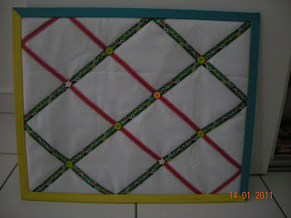 Sitôt reçu, sitôt testé! Je parle du livre Mes petits riens en Liberty de Mélanie Voituriez! Cela faisait un moment que j'étais tentée et voilà, j'ai cédé... Première réalisation, le pêle-mêle: en ce moment, mon grand affiche plein de petits bouts de papier sur son mur avec de la pata*fix. Le pêle-mêle devenait urgent! Comme mon grand est passionné de foot depuis la rentrée au CP, point de Liberty mais plutôt du ruban "foot"! Aucune difficulté, les explications sont limpides et le résultat est à la hauteur de mes espérances! Juste que je ne suis pas fana de couture à la main mais bon, devant la télé, ça passe! Mon grand, en tout cas, est ravi!